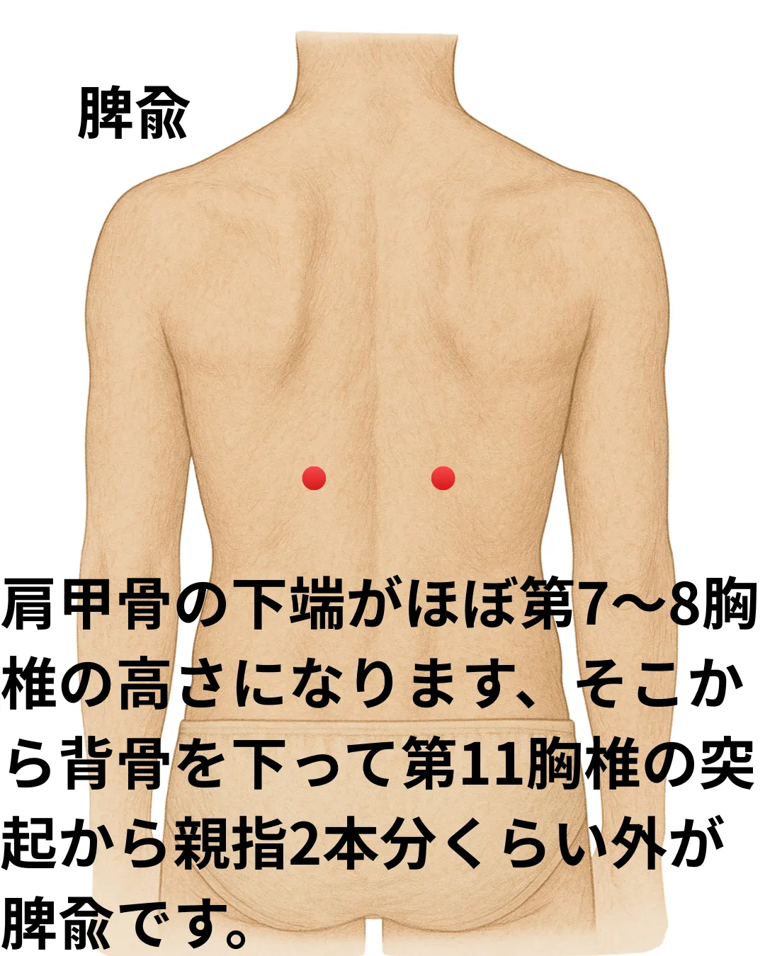 無月経の際によく使われるツボは「腎兪(じんゆ)」や「血海(けっかい)」です。腎兪は腰の高さで背骨の両側にあり、腎の働きを高めるとされています。血海は膝の内側、膝蓋骨の上縁から指3本分上で、血の巡りを良くします。